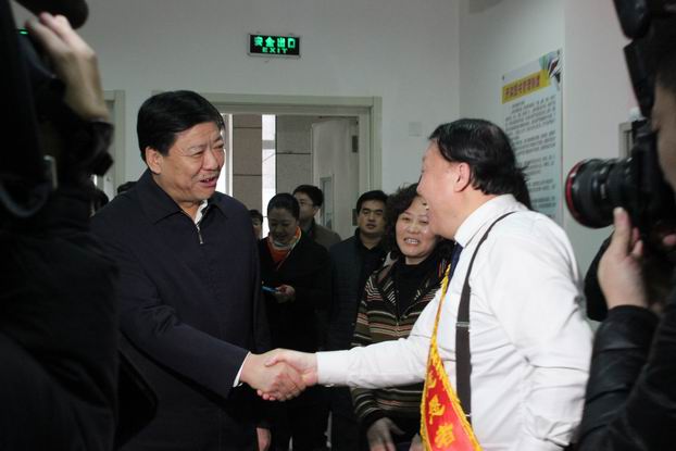 市委常委、市委政法委书记、市总工会主席袁桐利与潘强律师亲切握手、交谈