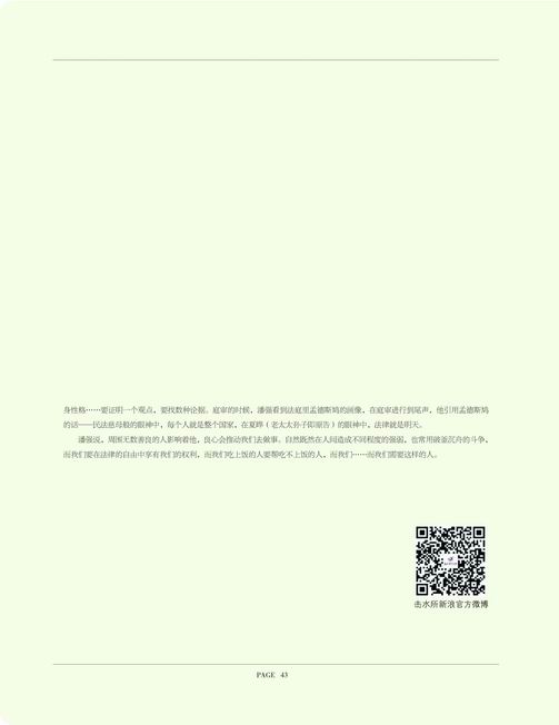他总是很忙,当事人对他的信任仿佛就自然而然从心里出来,一个接一个的找他,不远千里。他告诉我,一个四川的老太太,多番辗转来到这里,为她的孙子讨一个公道。老太太说她的孙子被老师打出了精神分裂症,当时少有人敢接这案子。那个时期,十个孩子里,有九个都被老师惩罚过,可别的孩子都好好的。他看到老太太期盼的目光,开始分析。根据精神病原理,环境因素、自身性格···要证明一个观点,要找数种论据。庭审的时候,潘强看到法庭里孟德斯鸠的画像,在庭审进行到尾声,他引用孟德斯鸠的话——民法慈母般的眼神中,每个人就是整个国家,在夏晔(老太太孙子即原告)的眼神中,法律就是明天。