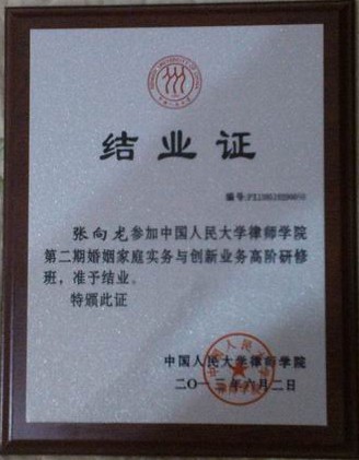 我所张向龙律师获中国人民大学律师学院第二期“婚姻家庭实务与创新业务”高阶研修班结业证
