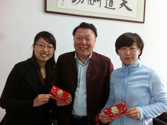 潘主任为于雪梅律师(右)、万志薪律师(左)发压岁钱