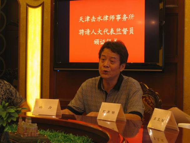 此次仪式邀请了河北区有线电视台记者全程拍摄报道。会上,我所聘请河北区人大代表、天津摩天集团有限公司董事长兼总裁苏建民先生,河北区人大代表、天津维多利亚投资发展有限公司总经理余海翔,河北区人大代表、天津市交通管理河北支队秩序科科长周文斌,河北区人大代表、天津公安河北分局宁园派出所所长郭永义,河北区人大代表、天津市工商行政管理局河北分局局长黄葆红担任击水律师事务所监督员。依据《天津市河北区人民代表大会常务委员会关于人大代表监督员工作办法》,我所监督员享有了解击水所执业情况的知情权,对律所和律师给予的建议权,对律所、律师及律师工作中存在问题提出的批评权以及获得免费的法律咨询权。