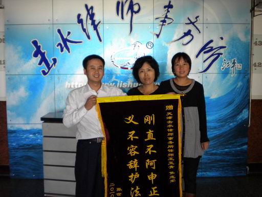 本所讯 2010年9月30日,当事人刘女士将一面写有“刚直不阿申正义 义不容辞护法威”的锦旗送到我所王玉青、焦志军律师的手中,对两位律师一段时间以来尽职尽责的工作表示诚挚的感谢。