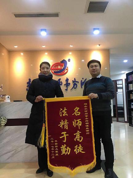 本所讯 2018年1月5日,当事人李女士来到天津击水律师事务所,将一面写有“名师高徒、法精于勤”的锦旗送给我所胡博晨律师,就律师代理此案以来的辛勤工作和优质的法律服务表示深深的谢意。